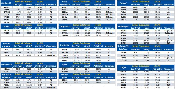 Not: Yukarıda yer alan hedef fiyatlar, potansiyel getiriler ve konsensus önerileri, Halk Yatırım öneri ve beklentileri değildir. Bu veriler, Reuters, Matriks, Bloomberg vb. güvenilir olduğuna inanılan ve en az 3 analist tarafından paylaşılan hedef fiyat ve tavsiyeler olup bilgi paylaşımı amacıyla listelenmiştir.