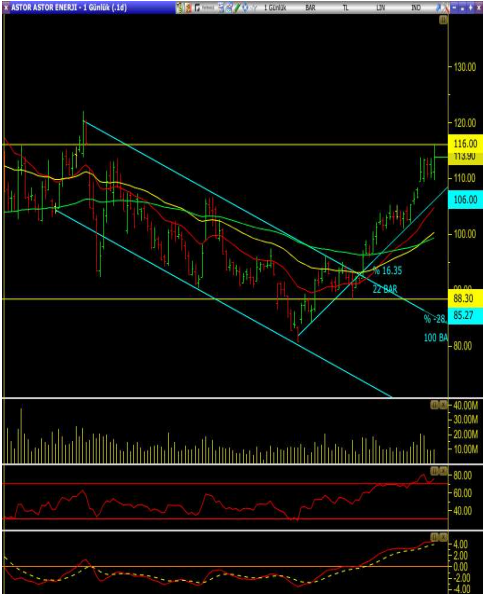 • Ancak hisse güçlü bir hacimle 116.00 seviyesini aşar ve kalıcılık sağlar ise yükselişin devamını görebiliriz.