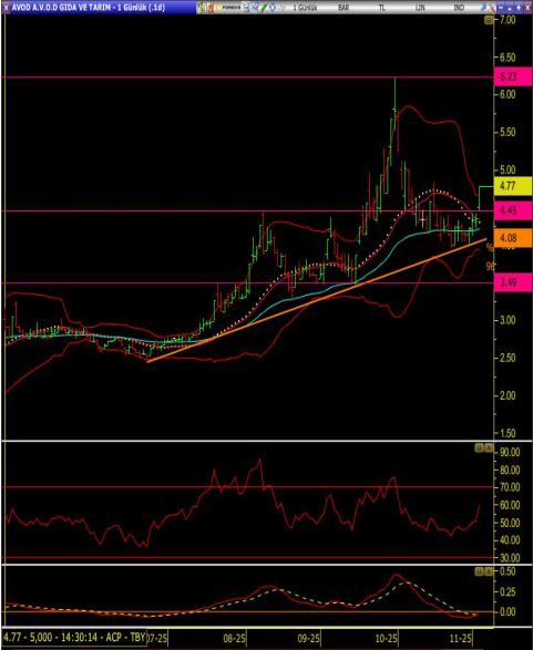 • Olası kar realizasyonlarında ise bollinger üst banda karşılık gelen 4.67 destek seviyesinde mevcut pozisyonlar korunabilir.