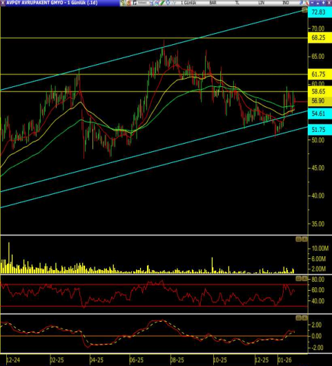 52–54 bandı güçlü bir destek olarak çalışmış ve buradan gelen alımlarla fiyat yeniden kısa ve orta vadeli hareketli ortalamaların üzerine çıkmayı deniyor.