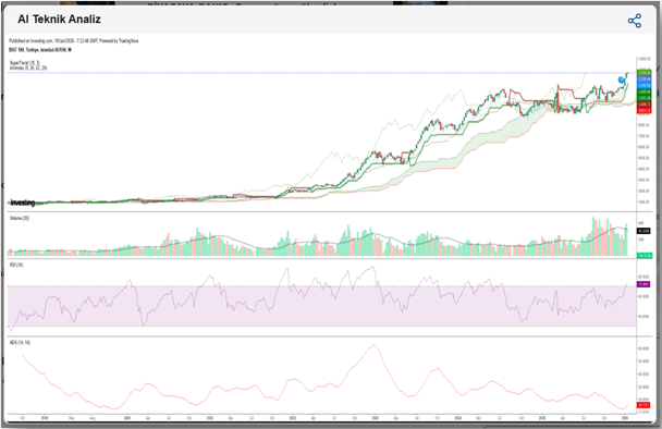 Endeks, tüm zamanların en yüksek seviyesini görerek fiyat keşif sürecine girdi. Haftalık bazda güçlü bir yukarı kırılım var; Ichimoku bulutu, SuperTrend ve hacim gibi tüm trend göstergeleri boğaları destekliyor. Ancak RSI ve CCI aşırı alımda; yani kısa vadede nefeslenme ya da kar realizasyonu gelebilir.