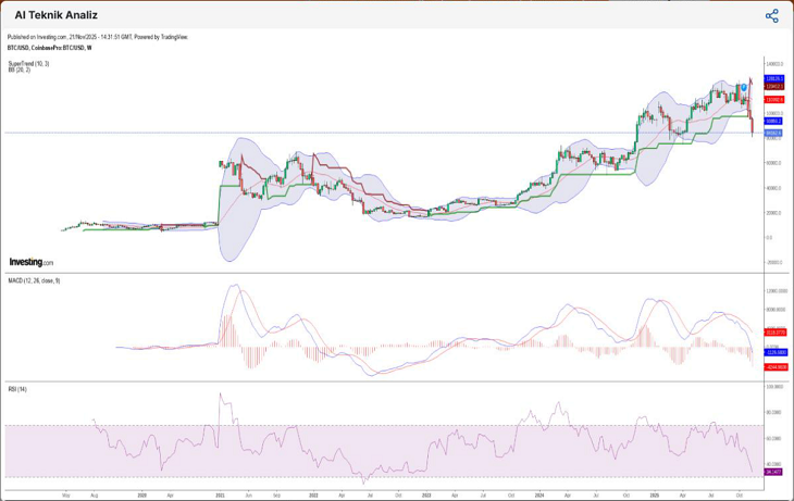 Haftalık SuperTrend göstergesi, 119.628 dolarda kesin olarak negatif tarafa döndü; bu, uzun vadeli trendin aşağı yönlüye geçtiğini onaylıyor.