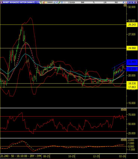 Fiyatın 10, 22, 50 ve 100 günlük hareketli ortalamaların üzerinde seyretmesi orta vadede toparlanma eğiliminin korunduğunu gösteriyor.