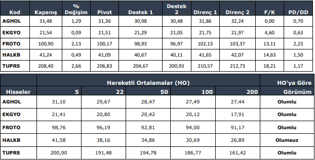 Teknik Göstergelerden MACD eşik değer olan ‘’0’’ seviyesinin üzerinde hareket etmekte ve hissenin pozitif görünümüne destek vermekte. Bir diğer teknik gösterge olan RSI ise ‘’82’’ seviyesine yükselerek alım bölgesinde hareket etmektedir. Momentum ise bugünkü yükseliş ile eşik değer olan ‘’100’’ seviyesinin üzerinde ‘’110’’ seviyesinde bulunmaktadır.