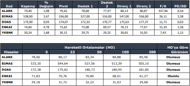 RSI göstergesi aşırı satımdan pozitif yönde tepki vermekte ve 47 puandan, 45 puana geriledi. Orta vadeli teknik göstergesi MACD ise sıfır ekseni altında pozitif eğilime yaklaşmaktadır. Bu çerçevede 10,670-10850-11000 seviyeleri direnç olarak izlenirken, aşağıda 10500, 10330 – 10264 seviyeleri destek konumunda bulunuyor.