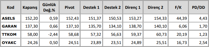 BİST100 endeksi dünkü işlemlerde 9957-10203 bandında hareket etti. Endeks gün sonunda %1,08 oranında değer kaybederek 9998 puandan kapattı. İşlem hacmi 100 milyar TL olarak gerçekleşti. Endekse en çok katkıyı ISCTR, RALYH, YKBNK sağlarken, TUPRS, THYAO, BIMAS baskılayan tarafta yer aldı. Sınai endeksi %1,37 değer kaybetti, bankacılık endeksi %0,49 değer kazandı. Bankacılık endeksinde kısa vadeli düzeltmenin etkisi ile dün en düşük 15524 puan test edildi. XBANK’ta, kısa vadede 15500’ün korunması, negatif görüntünün artmaması için önem arz etmektedir. Bu seviye altında geri çekilmelerde 15000 ve ardından da 14700-14500 destekler olarak izlenebilir. XBANK’ta 50 günlük AO 13636, 200 günlük AO 13663 puan ile birbirine oldukça yaklaşması orta vadeli trend açısından olumlu. 15500’ü haftalık bazda önemsiyor ve bu seviye üzerinde 15800 ve 16000 ilk dirençler olmak üzere 16300 ve 16500’ün hedefte olmasını bekliyoruz.