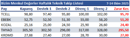 7-14 Ekim 2025 dönemi için teknik takip listemizde TCELL, EBEBK, KOZAL, THYAO ve KRDMD yer almaktadır.