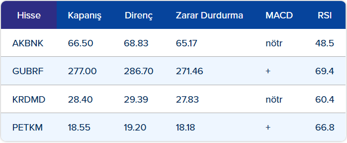 • Güne başlarken endeksin 5 günlük EMA’sı 10.906, 8 günlük EMA’sı ise 10.896 seviyesinde bulunuyor. Gün içinde bu ortalamaların üzerinde kalınması ve 10.940 direnç seviyesinin aşılması halinde, toparlanma eğiliminin devam etmesi beklenebilir. Bu senaryoda 10.975 ve 11.020 seviyeleri ilk hedefler olarak öne çıkacaktır. Diğer taraftan, 10.900 seviyesi ilk destek konumunda. Bu seviyenin altındaki fiyatlamalar risk algısında zayıflamaya işaret ederken, bir sonraki önemli destek seviyesi 10.850 puan olarak takip edilecektir.