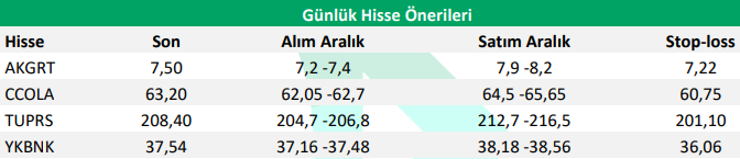 Aralık ayı prim üretimiyle yıl bazında büyüme geçen Aksigorta’yı, 2026’ya yönelik güçlü bir guidance açıklayan Coca-Cola’yı, İran kaynaklı jeopolitik kaynaklı arz endişeleri nedeniyle Tüpraş’ı ve bankacılık sektöründen Yapı Kredi Bankası’nı günlük hisse önerilerimiz arasında değerlendiriyoruz.