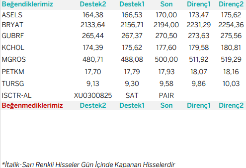 Günlük Bazda Yatırım Fikirleri’nde yer alan hisselerde günlük performans baz alındığından, yatırımcılar ilk aşamada %0.9-%2, ikinci aşamada %3.1-%4 aralıklarını pozisyon kapatma ve/veya kar alma seviyeleri olarak takip edebilirler.
