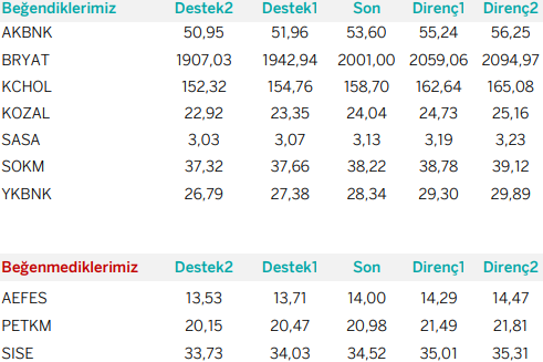 Günlük Bazda Yatırım Fikirleri’nde yer alan hisselerde günlük performans baz alındığından, yatırımcılar ilk aşamada %0.9-%2, ikinci aşamada %3.1-%4 aralıklarını pozisyon kapatma ve/veya kar alma seviyeleri olarak takip edebilirler.