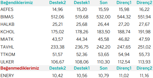 Günlük Bazda Yatırım Fikirleri’nde yer alan hisselerde günlük performans baz alındığından, yatırımcılar ilk aşamada %0.9-%2, ikinci aşamada %3.1-%4 aralıklarını pozisyon kapatma ve/veya kar alma seviyeleri olarak takip edebilirler.