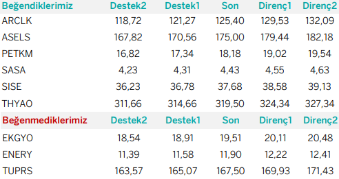 Günlük Bazda Yatırım Fikirleri’nde yer alan hisselerde günlük performans baz alındığından, yatırımcılar ilk aşamada %0.9-%2, ikinci aşamada %3.1-%4 aralıklarını pozisyon kapatma ve/veya kar alma seviyeleri olarak takip edebilirler.