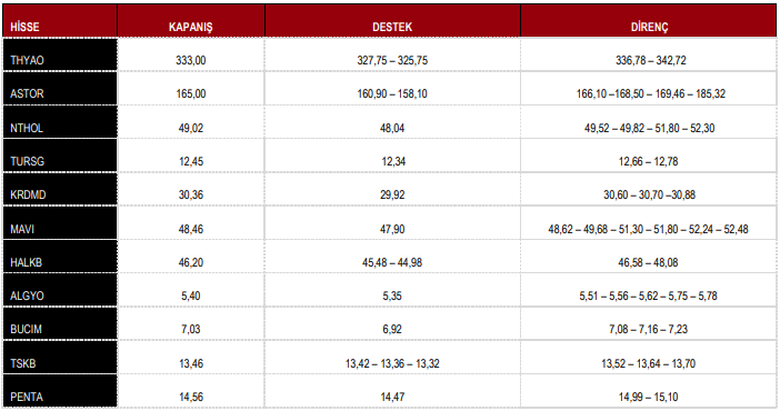 BIST100 endeksi dün 13.726 seviyesine geriledi. 13.620, 13.521 (boşluk) ve 13.402 seviyeleri önemli destekler, 13.106 ise diğer önemli boşluk seviyesidir. 13.888 (daha aşağıda ikinci tepe) ve 13.998 seviyeleri direnç olarak izlenebilir. Yatay bandın kırılması durumunda aşağı ya da yukarı yönlü yaklaşık 596 puanlık bir marj oluşabileceğini düşünüyoruz.