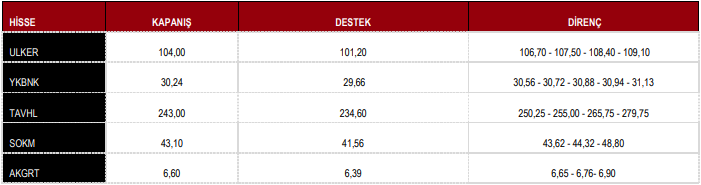 BIST100 endeksinde 10.720 (boşluk) ve 10.784 seviyelerinde kâr satışları görülebilir. 10.862-10.928 bandı (yükselen trende geri dönmek için geçilmesi gereken direnç aralığı) sonraki direnç bölgesi olarak izlenebilir. Geri çekilmelerde ise 10.467 (boşluk) kapanabilir, 10.408-10.284 aralığı ise ara destek olarak tepki amaçlı alım yönünde değerlendirilebilir.