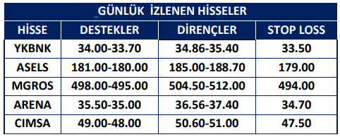 Borsada çıkış trendi sürüyor. İlk destekler 11.330-11.290 olarak görülüyor. Bu seviyeler günlük işlemlerde öne çıkabilir. Sonraki destekler 11.240-11.200 ve 11.150 seviyelerinde. İlk dirençler 11.390-11.450 noktalarında. 11.450 daha önemli. Sonraki dirençler ise 11.550-11.600 seviyelerinde. Endekste çıkış hareketi gücünü korumakla birlikte direnç noktalarında satış denemeleri görülebilir.