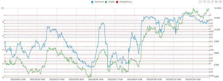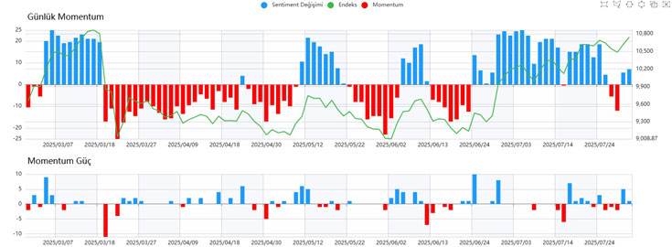 Ayın son işlem günü, beklendiği üzere yüksek volatilitenin öne çıktığı bir seyirle tamamlandı. Gün pozitif bir açılışla başlarken, ardından sert bir geri çekilme yaşandı. Ancak öğleden sonra gelen güçlü alımlarla toparlanma sağlandı ve endeks günü güçlü bir görünümle kapattı. Sentiment 8.30 seviyesinin üzerinde kapanış gerçekleştirirken, Günlük Momentum da pozitif bölgede kaldı.