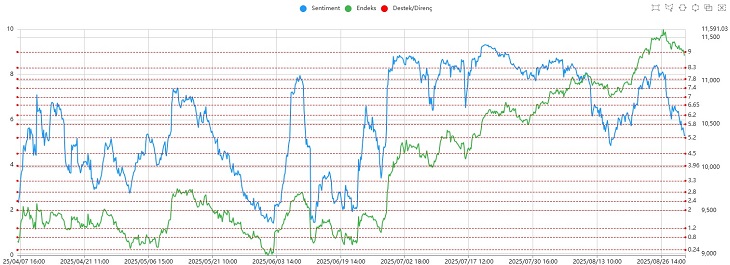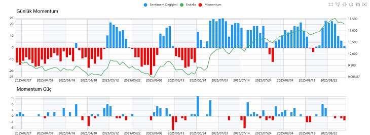 Dolayısıyla yükseliş trendinin devamı için bu bölgelerin destek olarak çalışması ve yeniden yukarı yönlü tepki hareketlerinin gelmesi önem taşıyor. Aksi halde kısa vadede yükselişin duraklayacağı bir dönemle karşılaşabiliriz. Günlük Momentum tarafında mavi barların devam ettiği ancak alıcı gücünün kademeli olarak zayıfladığı bir hafta geride kaldı. Bu durum, piyasada kritik bir karar aşamasına işaret ediyor. Bundan sonraki süreçte kırmızı barların oluşması ve satıcıların daha aktif hale gelmesi, negatif görünümü güçlendirecektir. Sentiment tarafında kısa vadede ilk kritik seviye 6.65 direnci olarak öne çıkarken, ana yükselişin güç kazanabilmesi için 7.80 üzerine yerleşilmesi gerekiyor. Bununla birlikte endekste 11.600 direncinin aşılması da büyük önem taşıyor.