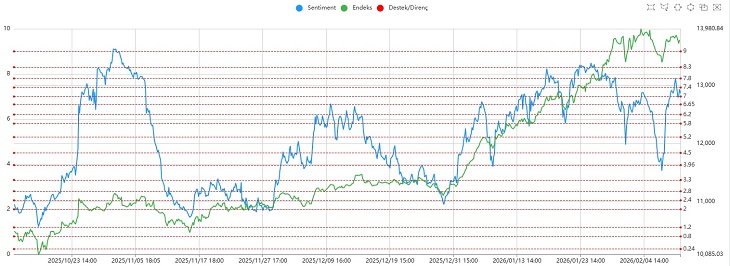 Sentiment tarafında gün içinde 7.80 direnci test edilse de kapanış 7.00–7.40 bandında gerçekleşti. Olası geri çekilmelerde 6.65 seviyesinin korunup korunamayacağı, mevcut piyasa algısının yönü açısından kritik bir eşik niteliği taşıyor ve yakından takip edilmeli.