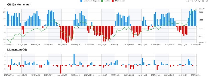 Günlük momentum tarafında güçlü seyir korunuyor. Mavi barların belirgin ve istikrarlı şekilde güçlü kalması, alım momentumunun halen canlı olduğunu ve piyasa genelinde risk iştahının yüksek seyrettiğini net biçimde ortaya koyuyor. Bu görünüm, yükselişin sadece fiyat bazlı değil, aynı zamanda momentum tarafında da desteklendiğini gösteriyor.