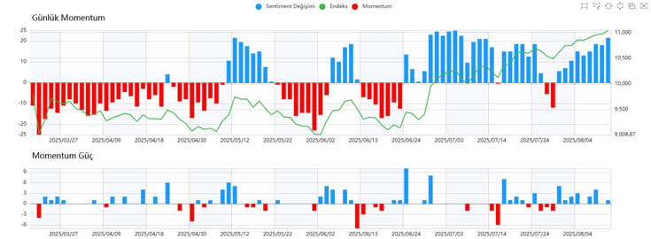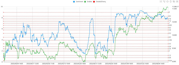 Sentiment göstergesi 7.80 destek seviyesinde tutunmayı sürdürüyor. Alt tarafta ise kritik 6.20 seviyesi ana destek konumunda bulunuyor. Bu seviyenin üzerinde kalındığı sürece mevcut yükseliş eğiliminin korunması beklenir.