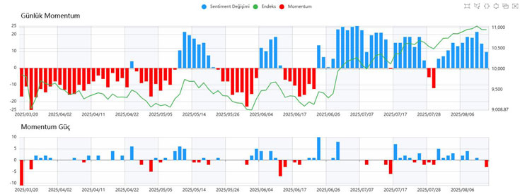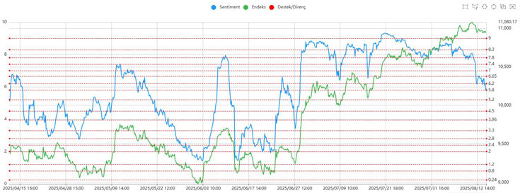 Günün hareketli seyri sonunda endeks, gün içindeki dalgalanmalara rağmen yatay bir kapanış yaptı. Sentiment göstergeleri ise geri çekilmeye devam ederek 5.80–6.20 aralığındaki kritik destek bölgesine geriledi. Bu seviyenin altına inilmesi durumunda satış baskısının güçlenmesi ve satıcıların piyasa kontrolünü artırması muhtemel görünüyor.