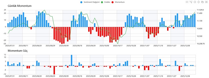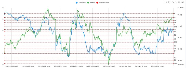 Daha önce de vurguladığımız 11.600 seviyesi endeks için önemli bir direnç konumunda ve fiyatlama bu bölgeye yaklaşmış durumda. Sentiment tarafında ise 6.65 seviyesinin üzerine çıkılması halinde 8.30 direncine kadar daha hızlı bir yukarı hareket görme ihtimalimiz artacak. Yılın son haftalarına girerken bu seviyeler, yükselişin devam edip etmeyeceği açısından ana karar bölgeleri olarak öne çıkıyor.