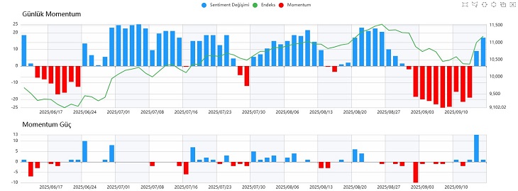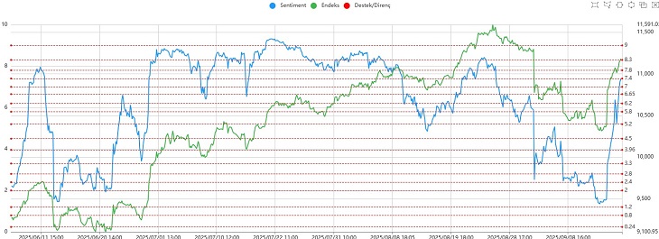 Endeks tarafında, pozitif haber akışının etkisiyle başlayan sert yükselişin ardından alımlar bugün de güçlü bir şekilde devam etti. Sentiment göstergesi 1,20 seviyelerinden 7,40’a kadar tırmandı. Ancak kısa sürede yaşanan bu hızlı yükselişin ardından, yarın kar satışlarıyla karşılaşma ihtimali artmış durumda.