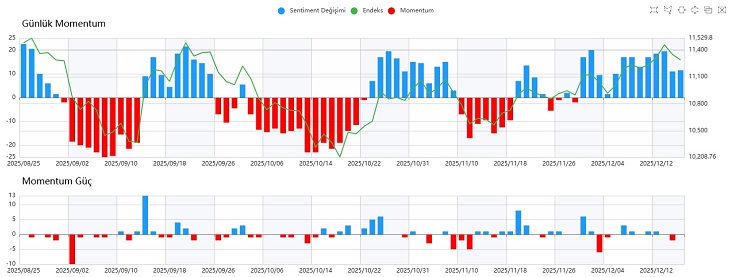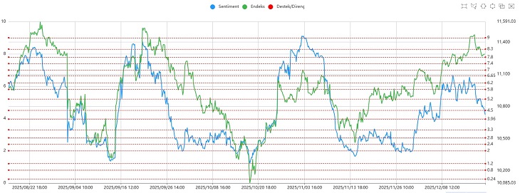 Endeks ve sentiment tarafında zayıf seyir üst üste ikinci günde de devam etti. Güne satış baskısıyla başlanırken, öğleden sonra gelen kısmi toparlanma çabaları kayıpların tamamını telafi etmeye yetmedi ve kapanış yine negatif bölgede gerçekleşti. Özellikle sentiment verisinin kritik 5.20 destek bölgesinin altına sarkması, piyasadaki satış baskısını derinleştiren temel unsurlardan biri oldu.
