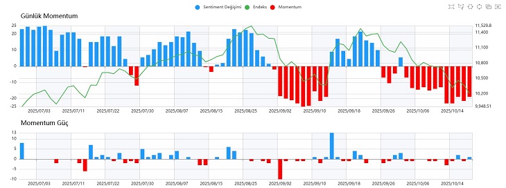 Günlük Momentum tarafında zayıf görünüm sürerken, kırmızı barların hakimiyeti devam ediyor. Bu durum, kısa vadede alıcıların güç kazanmakta zorlandığını gösteriyor. Saatlik Momentum tarafında ise zaman zaman alıcıların devreye girdiği görülse de bu hareketler henüz düzenli ve sürdürülebilir bir yapıya kavuşmuş değil. Satış tarafındaki istikrarlı görünüm korunurken, piyasanın güç kazanabilmesi için alıcı momentumu tarafında kalıcı bir dönüş sinyaline ihtiyaç var.