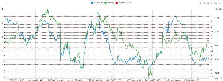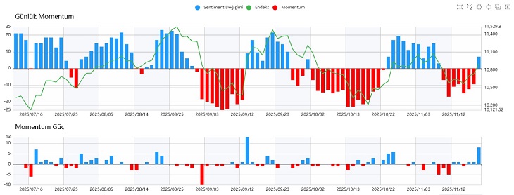 Sentiment tarafında ise endeksteki pozitif havaya rağmen 3.30 direnci henüz aşılamadı. Bu seviyenin geçilememesi, alım momentumunda kısa vadeli bir zayıflama riskine işaret ediyor. Buna rağmen Sentiment görünümünün genel olarak toparlanma yönünde eğilim gösterdiğini söylemek mümkün.