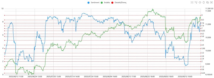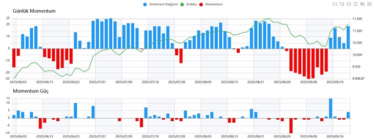 Sentiment tarafında 1,20 seviyelerinden başlayan hareket 8,00 seviyelerine kadar taşınmış durumda. Yeniden 9’lu seviyelere doğru bir dönüş yaşanması halinde bu yükselişin bir ralliyi tetikleme ihtimali giderek artıyor. Günlük Momentum bu hafta mavi bölgeye geçti ve haftayı da bu bölgede tamamladı. Genel görünüm, yatırımcı psikolojisinin yeniden olumluya döndüğüne işaret ediyor. Saatlik Momentum’da da ağırlıklı olarak mavi barların öne çıkması, kırmızı barların kısa süreli kalmasıyla birlikte alıcı gücün güçlü seyrettiğini gösteriyor.