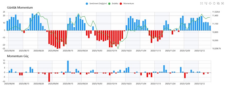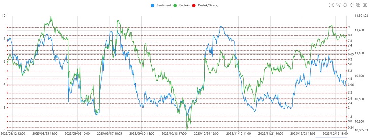 Pazartesi günü piyasada genel olarak daha güçlü bir görünüm hakimdi; ancak 11.600 seviyesinin aşılamaması ve Sentiment tarafında 6.65 direncinde takılmamız nedeniyle zayıflama başladı. Salı ve Çarşamba günleri satış baskısı öne çıkarken, Perşembe ve Cuma günleri sınırlı toparlanmalar izlendi ve haftayı genel olarak yatay bir görünümle kapattık.
