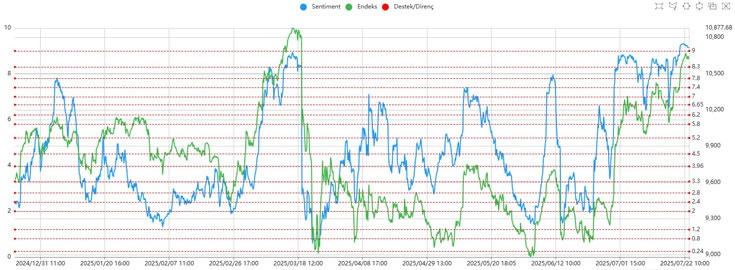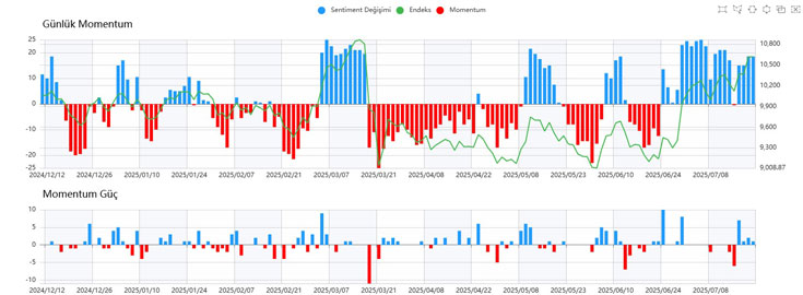 Gün içinde özellikle EKGYO, ASELSAN ve bankacılık hisselerinde belirgin şekilde sert hareketler yaşandı. Bu hisselerde volatilitenin yükselmesi dikkat çekerken, yatırımcıların hem alım hem de satış yönünde aktif olduğu gözlendi. Tüm bu hareketliliğe rağmen, Sentiment endeksi 9 seviyesinin üzerinde kalmayı başardı. Bu da piyasada risk iştahının ve yatırımcı ilgisinin güçlü kaldığını teyit ediyor.