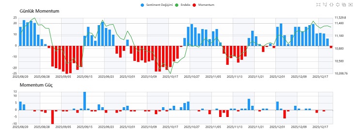 Sektörel tarafta bankacılık hisseleri görece daha dirençli bir görünüm sergilerken, ulaştırma ve perakende tarafında satış baskısı belirginleşti. Genel görünümdeki bozulma eğilimiyle birlikte günlük momentum uzun bir aranın ardından kırmızı bölgede, saatlik momentum ise negatif bölgede kapanış yaptı.