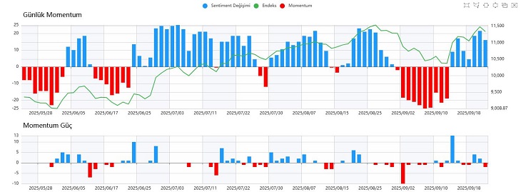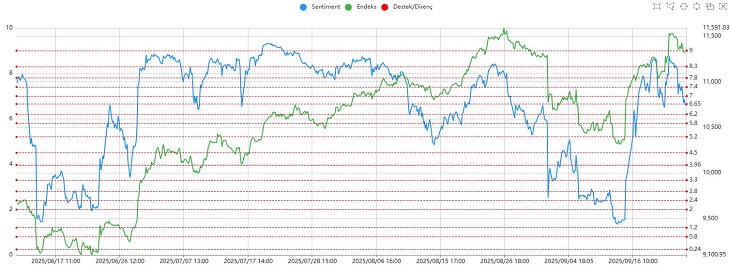 Sabah gelen olumsuz haber akışıyla birlikte endekste geri çekilme yaşandı. Son iki gündeki hızlı yükselişin ardından özellikle bankacılık ve holding hisselerinde satış baskısı öne çıktı. Bu süreçte Sentiment göstergesi 6,65 desteğine kadar geriledi. Bu seviye kritik bir eşik olup, yukarı yönlü eğilimin korunabilmesi için üzerinde kalıcılık sağlanması gerekiyor.