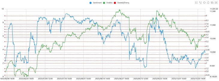 Gün boyunca dalgalı bir seyir izlenmesine rağmen, genel olarak pozitif görünüm korundu. Merkez Bankası’nın faiz indirimi kararı sonrasında piyasada iyimser hava devam etti. Sentiment göstergesi 3.96 seviyesine kadar yükseldi ancak bu bölgede kar satışları etkili oldu.