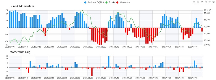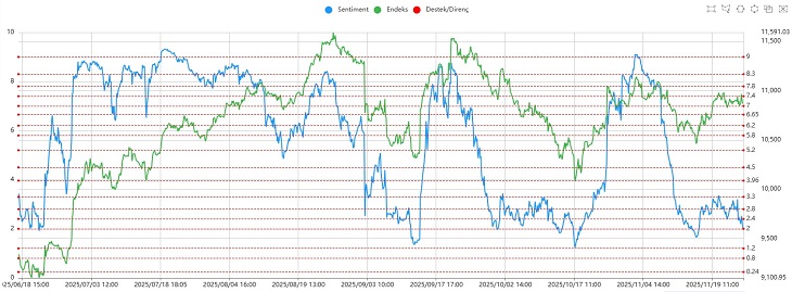 Sentiment göstergesi zayıf seyrini sürdürüyor. Gösterge 2.00 desteğine kadar gerilemiş durumda ve bu seviyenin altında 1.20 bandına doğru bir çözülme riski bulunuyor. Bu nedenle kısa vadede temkinli duruşu korumak önem taşıyor.