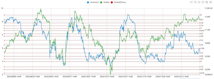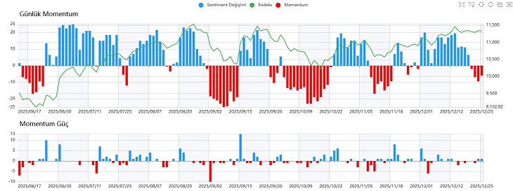 Endeks ve Sentiment güne güçlü bir açılışla başlasa da, gün içinde gelen satışlarla birlikte kazanımlarını koruyamadı ve geri çekilme yaşandı. Son dönemde görülen pozitif tepki hareketlerinin satışlarla karşılanması, alım momentumunun kademeli olarak zayıflamasına neden oluyor. Sektörel tarafta bankacılık ve perakende hisseleri görece daha zayıf bir görünüm sergilerken, madencilik ve çimento hisselerinde kısmi pozitif ayrışma izlendi. Mevcut tabloda satış baskısının artması halinde daha dikkatli olmak da fayda olabilir.