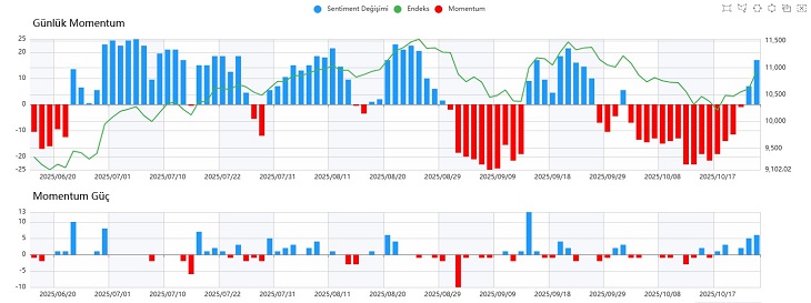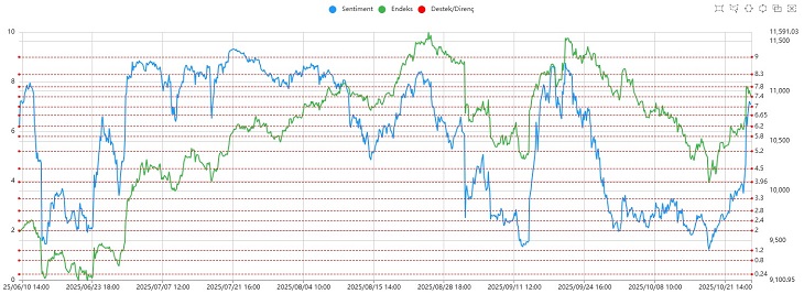 Geçtiğimiz Cuma günü 1.20 seviyesinden gelen tepkiyle başlayan Sentiment toparlanması, hafta boyunca güçlenerek devam etti. Merkez Bankası’nın faiz indirimi kararı ve CHP Kurultay iptal davasının reddedilmesi gibi gelişmeler, piyasalarda belirgin bir iyimserlik yarattı. Bu alıcı iştahının etkisiyle Sentiment haftayı 6 seviyesinin üzerinde kapattı. 3.30 ve 5.20 dirençlerinin aşılması görünümü desteklerken, yeni haftada 8.30 seviyesi kritik direnç konumunda olacak. Bu seviyenin üzerinde kalıcılık sağlanması, yükseliş trendinin devamı açısından önemli.