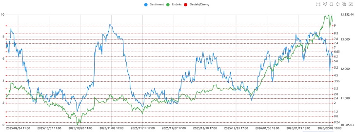Sentiment, gün içinde 5.20 seviyesinin altına sarkmasına rağmen bu bölgeden gelen tepki alımlarıyla 6.20 seviyelerinde kapanış gerçekleştirdi. Son dönemde sürdürdüğümüz güçlü yükseliş trendi henüz bozulmuş değil; ancak belirgin yorulma emareleri dikkat çekiyor. Bu nedenle artan oynaklık ortamında daha temkinli ve kontrollü hareket edilmesi gerektiğini düşünüyoruz.