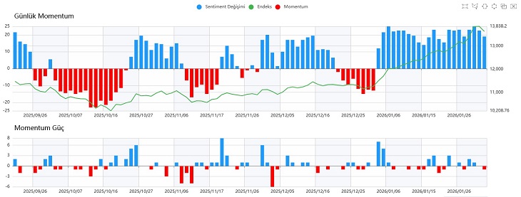 Günlük momentum tarafında mavi bölgede kalmaya devam ediyoruz ve şu aşamada net bir bozulma söz konusu değil. Buna karşın saatlik periyotlar oldukça dalgalı bir günü geride bıraktı ve kapanışlar negatif bölgede gerçekleşti. Bu görünüm, kısa vadede temkinli duruşun korunmasının önemine işaret ediyor.