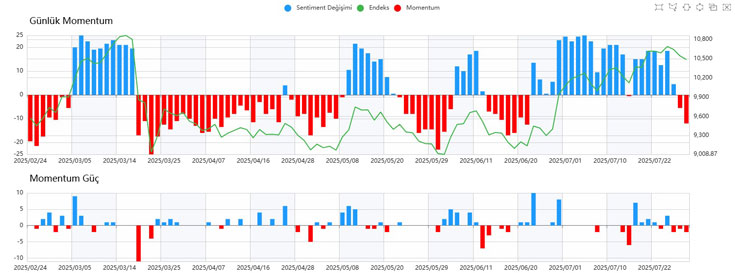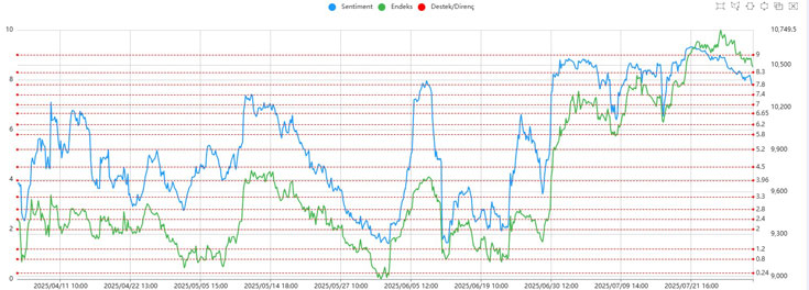 Endekste satış baskısı sürdü ve satışların gittikçe daha geniş bir alana yayıldığı görüldü. Son günlerdeki zayıf seyir, yatırımcıların temkinli kalmasına yol açarken, yukarı yönlü denemeler sınırlı kaldı. Sentiment Endeksi 7.80 desteğinde ve bu seviye kısa vadede yön tayini açısından kritik bir eşik.