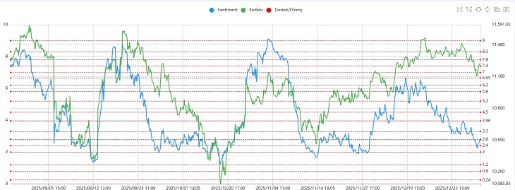 Sentiment tarafında ise 2.00–2.40 bandından gelen tepkiyle birlikte gün 2.40 seviyesinin üzerinde kapanış gerçekleşti. Mevcut görünüm, kısa vadede tepki alımlarının öne çıktığını ancak piyasanın halen dalgalı bir zeminde ilerlediğini gösteriyor.