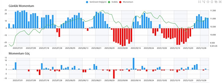 Sektörel bazda bilişim, demir-çelik, ulaştırma ve sigorta endeksleri güçlü performans sergilerken; iletişim ve inşaat tarafında zayıf bir seyir izlendi. Günlük Momentum tarafında pozitif görünüm devam ediyor. Saatlik Momentum kapanışa doğru bir miktar zayıflasa da, mavi barların sürmesi, alıcı eğiliminin kısa vadede halen baskın olduğunu işaret ediyor.