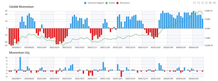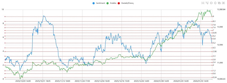 Bu satışların etkisiyle Sentiment 5.20 desteğine kadar geri çekildi. Endeks cephesinde 13.500–13.600 bandı, kısa vadede yakından izlenmesi gereken kritik bir destek bölgesi olarak öne çıkıyor. Bu bandın altına sarkmamız durumunda, satış baskısının bir süre daha devam etme riski bulunuyor.