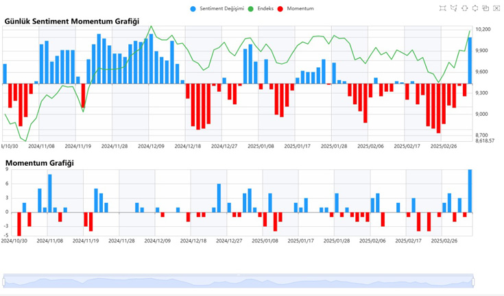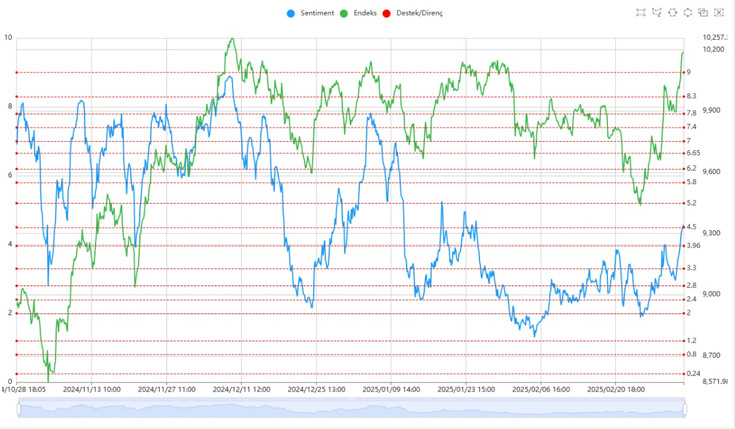 Günlük Momentum güçlü bir yükselişle mavi bölgeye geçerken, saatlik Momentum pozitif bölgede kalmaya devam ediyor, yani kısa vadede de alım iştahı korunuyor. Sentiment Endeksi’nin yukarıda 5.20 ve 5.80 seviyelerinde dirençleri bulunurken, aşağıda 3.96 seviyesi destek olarak takip ediliyor.