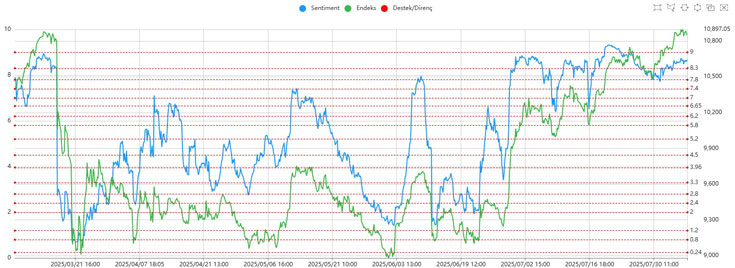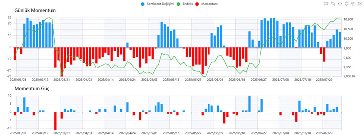 Endeks ve Sentiment tarafında pozitif trend korunuyor. Ancak 10.900 direnci kritik bir eşik olarak öne çıkıyor. Bu seviyenin üzerinde kalıcı bir kapanış yapılamaması, ara ara satıcı baskısının hissedilmesine neden oluyor. Direncin aşılması halinde yukarı yönlü hareketin daha güçlü bir ivme kazanması beklenebilir.