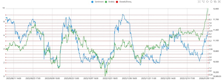 Sektörel bazda bakıldığında savunma, ulaştırma ve perakende gruplarında pozitif ayrışma öne çıkarken, bu alanlardaki alımlar endeksi destekleyen ana unsurlar arasında yer alıyor. Sentiment tarafında ise yukarı yönlü hareketin 6.65 seviyelerine kadar devam ettiği görülüyor. Günlük ve saatlik periyotlarda alım momentumu ise güçlü bir şekilde devam ediyor.