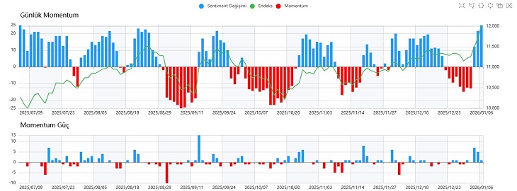 Endeks tarafında yılın başında başlayan yükseliş ivmesi güçlenerek devam ediyor. 11.600 direnç bölgesinin ve Sentiment tarafında 5.20 seviyesinin aşılmasıyla birlikte yatırımcı ilgisi belirgin şekilde artarken, risk iştahında da net bir toparlanma izleniyor. Alıcı momentumu özellikle BIST 30 hisseleri özelinde daha güçlü bir görünüm sergiliyor.